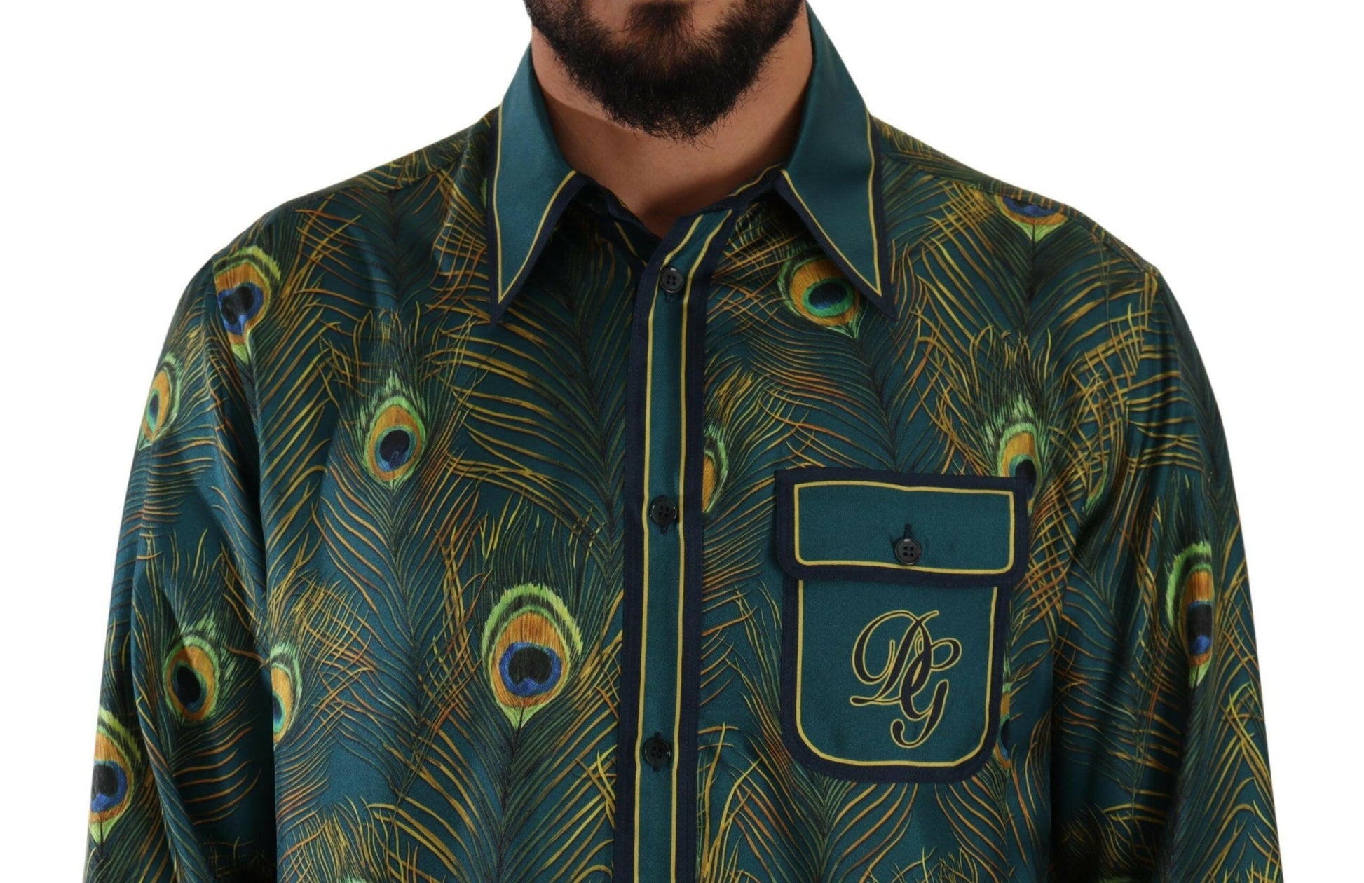 Wunderschönes, brandneues Hemd mit Etikett, 100 % authentisches Dolce & Gabbana. Modell: Langarmhemd Material: 100% Seide Passform: Normale Passform Farbe: Grüner Pfauenfederdruck Durchgehender Knopfverschluss vorne Logodetails Hergestellt in Italien