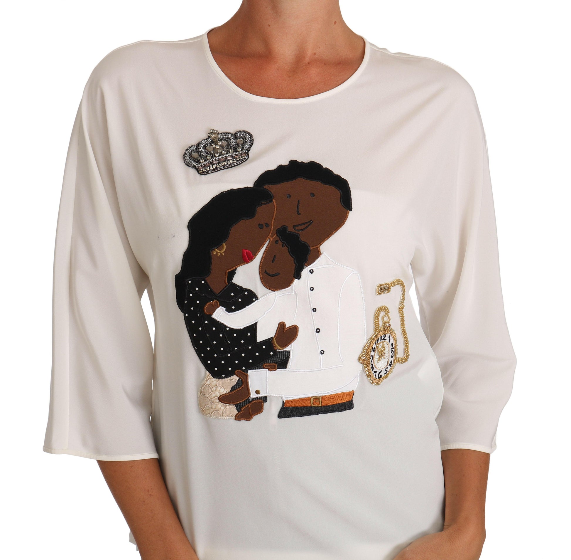 Laissez-vous séduire par le savoir-faire italien avec cette exquise blouse Dolce & Gabbana . Parfaitement taillée avec ses manches 3/4 chics et son élégant col ras du cou, ce haut t-shirt est un chef-d'œuvre de mode. Orné d'un appliqué Figure Family multicolore éclatant, ce haut est une véritable incarnation de la collection #dgfamily. Orné d'une couronne ornée de cristaux et d'une montre de poche, cette pièce est plus qu'un simple vêtement : c'est une œuvre d'art à porter.