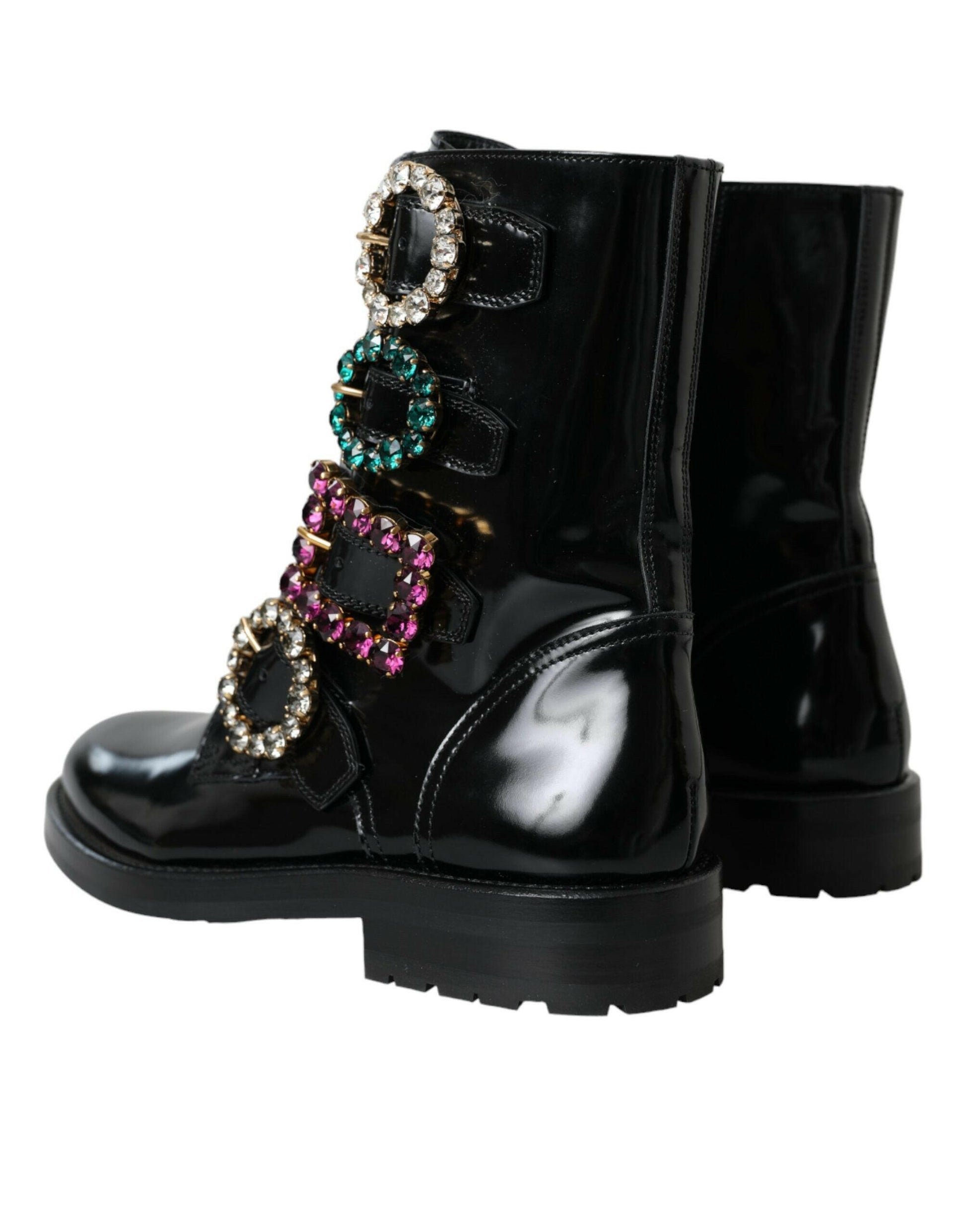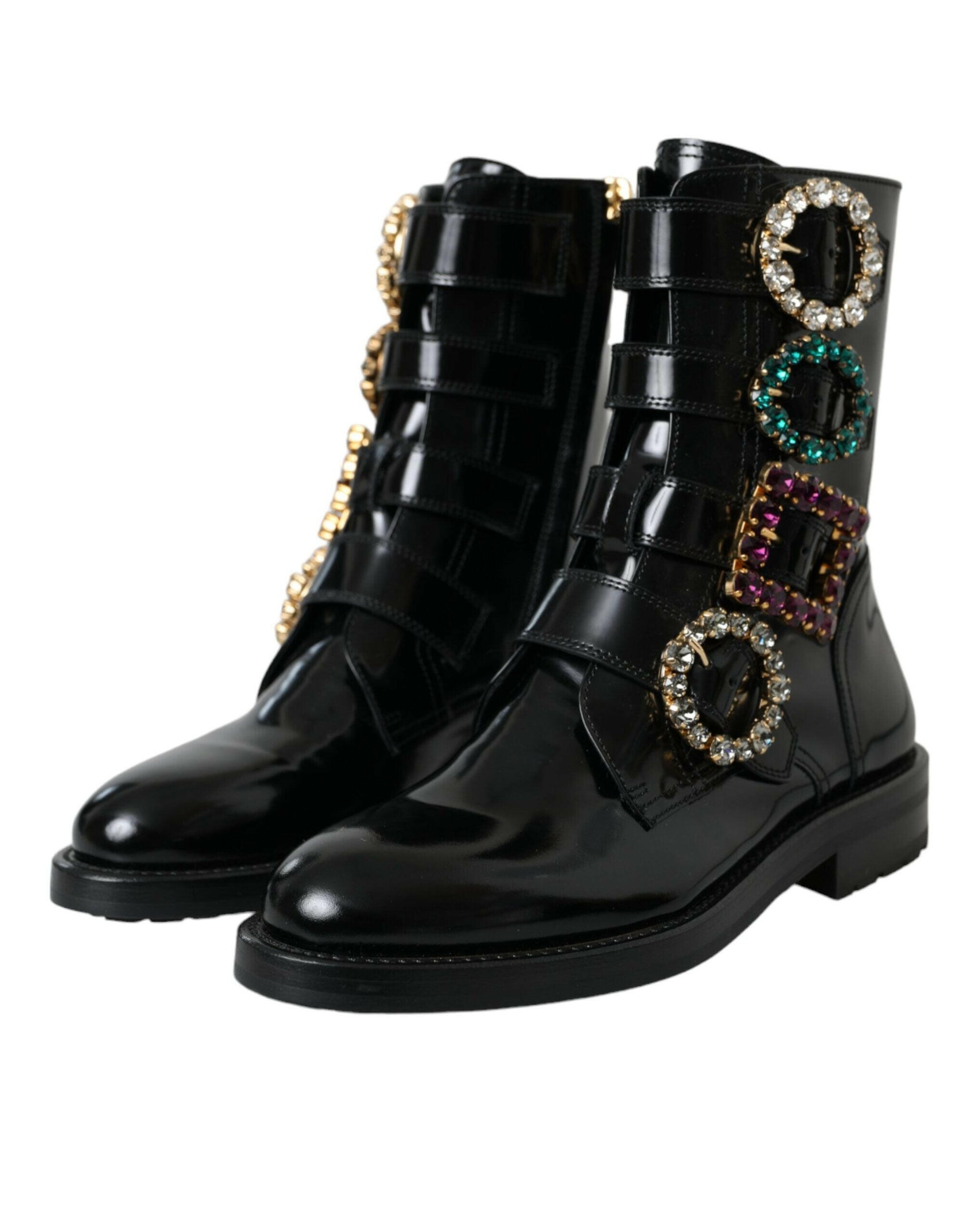 Dolce & Gabbana Black Leather Crystal Buckles Boots Shoes