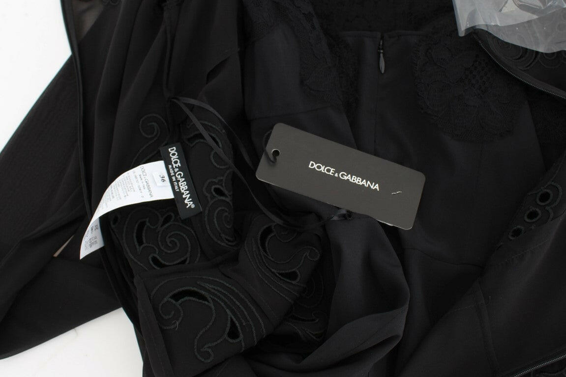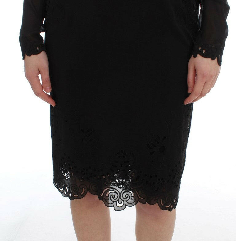 Model: Knee length sheath bodycon Color: Black Motive: SICILY Stretch silk inner lining Back zipper closure Floral cutout and lace detailing Logo details Made in Italy Very high craftmanship and exclusively rare. Material: 12% Elastane, 78% Silk, 10% Viscose Lining: 76% Silk, 4% Elastane, 16% Cotton, 4% Nylon